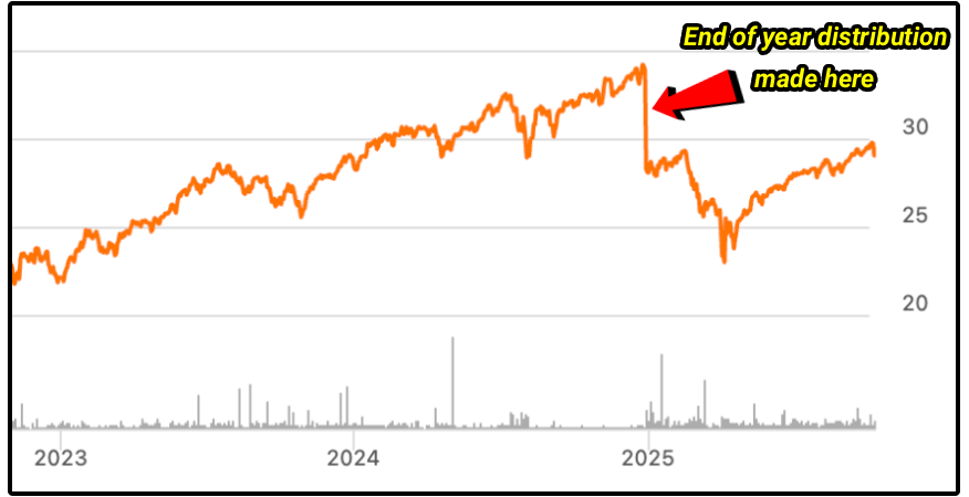 Because of this, the yield appears much higher than usual when a large distribution is made at the end of the year.