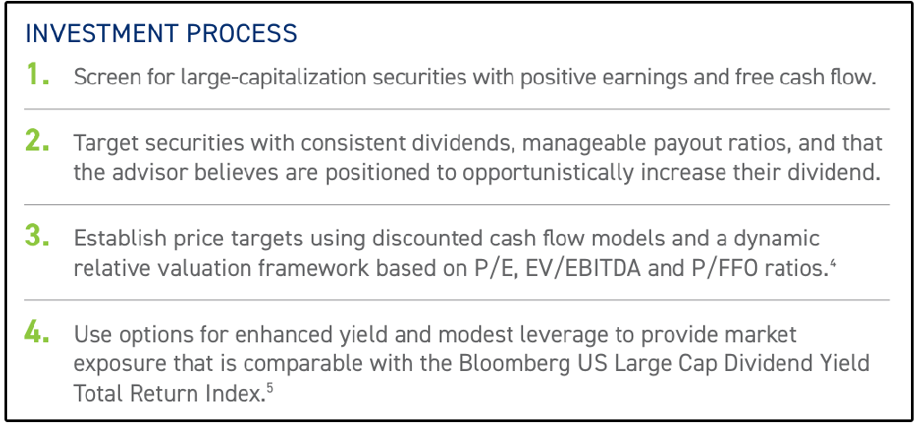 ICAP holds individual large-cap dividend stocks (like AT&T and Exxon) and writes short-term, single-stock covered calls instead.