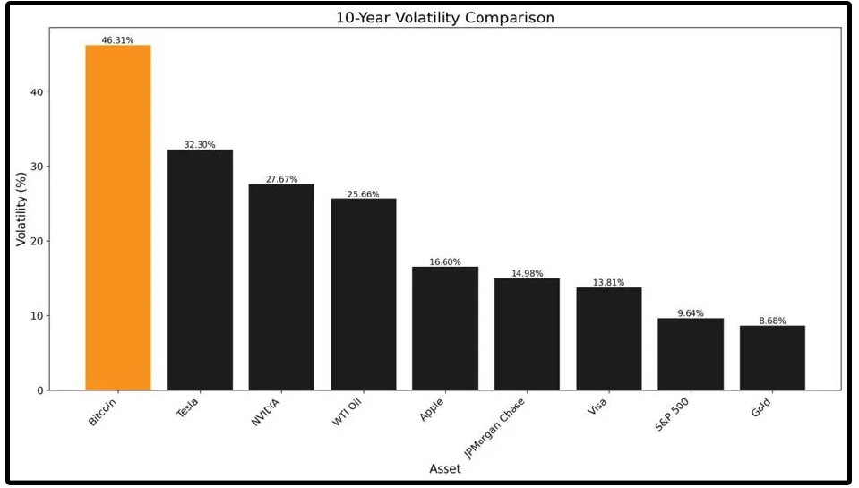Bitcoin’s volatility (46.3%+) is nearly 5x higher than the S&P 500, and more volatile than every major asset.