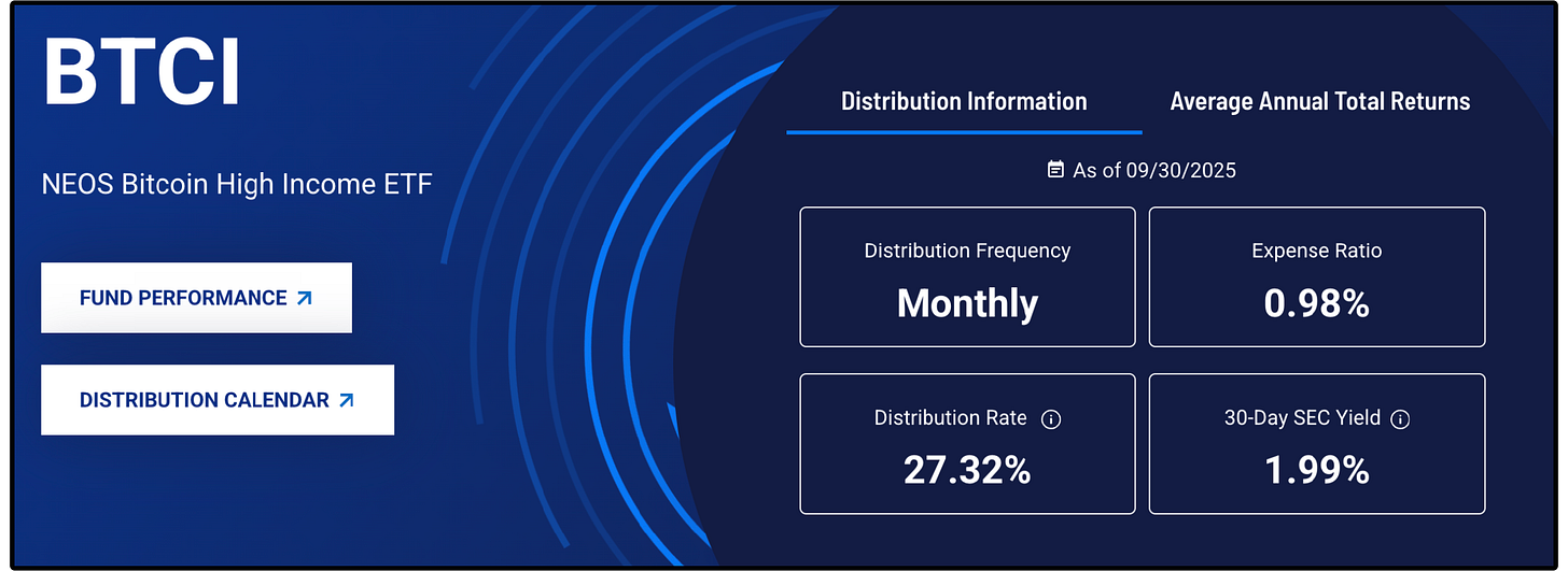 BTCI launched in October 2024 and has only operated during a bullish Bitcoin environment. Its performance and distribution sustainability in a bear market have not been put to the test… But it will at some point.