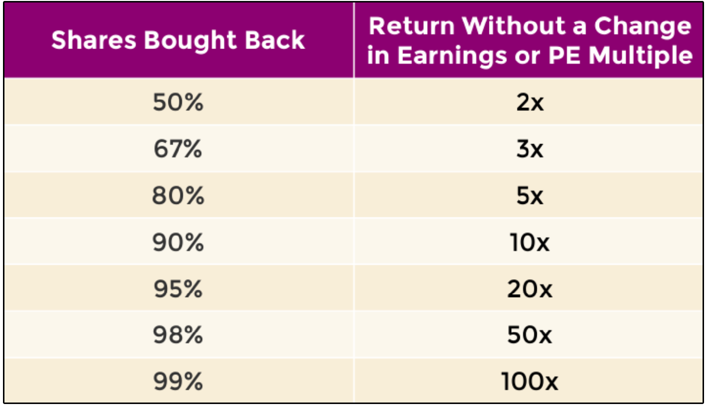 Without a change in the PE multiple, a 50% reduction in shares outstanding causes the stock to double!