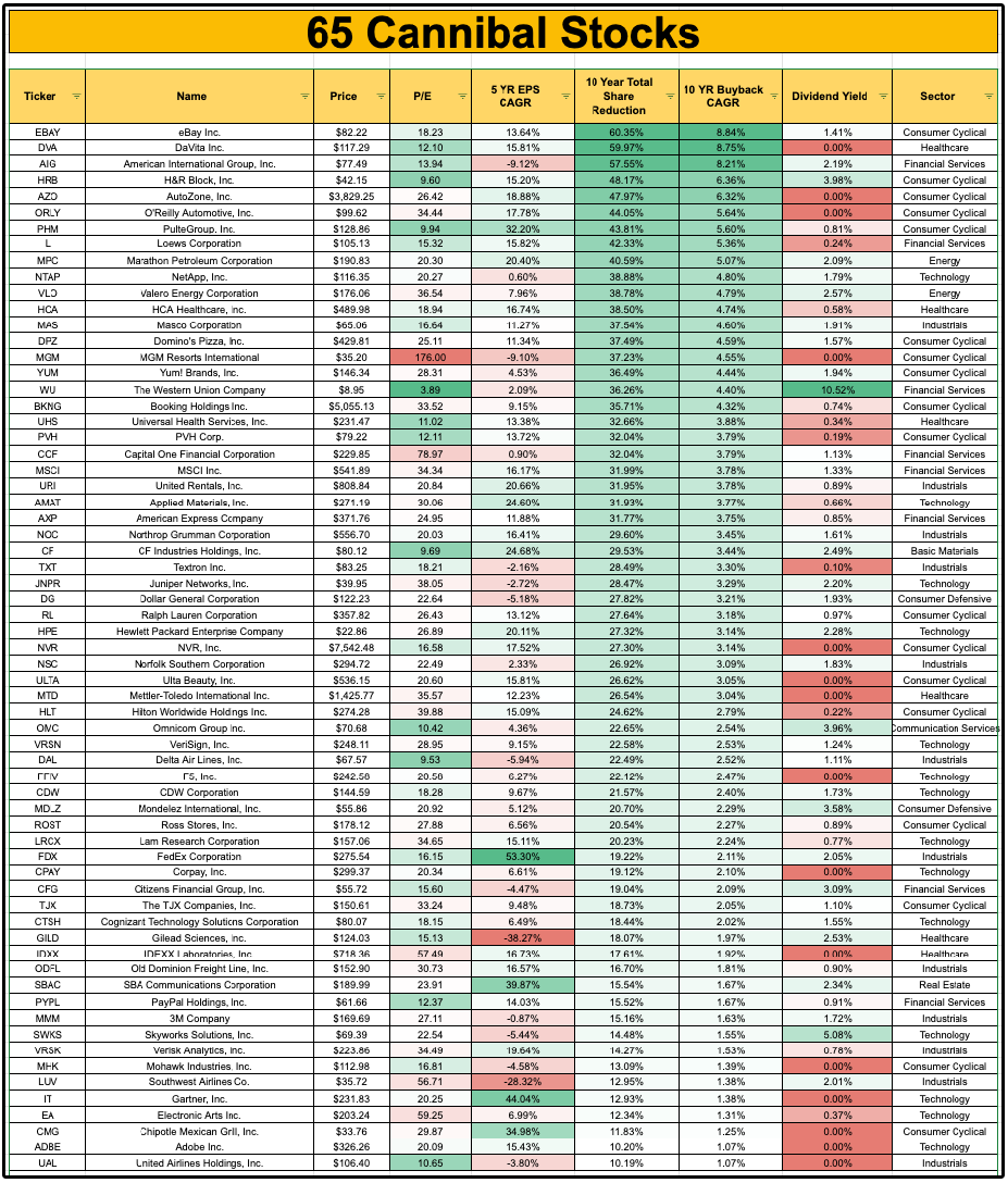 Stocks that have bought back more than 10% of their outstanding shares in the last decade.