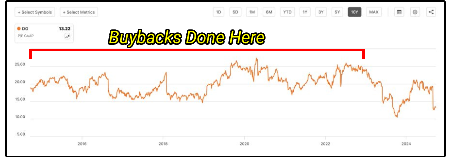 For the majority of the past decade, Dollar General was buying back shares when the company had a P/E ratio ranging from 17 to 26.