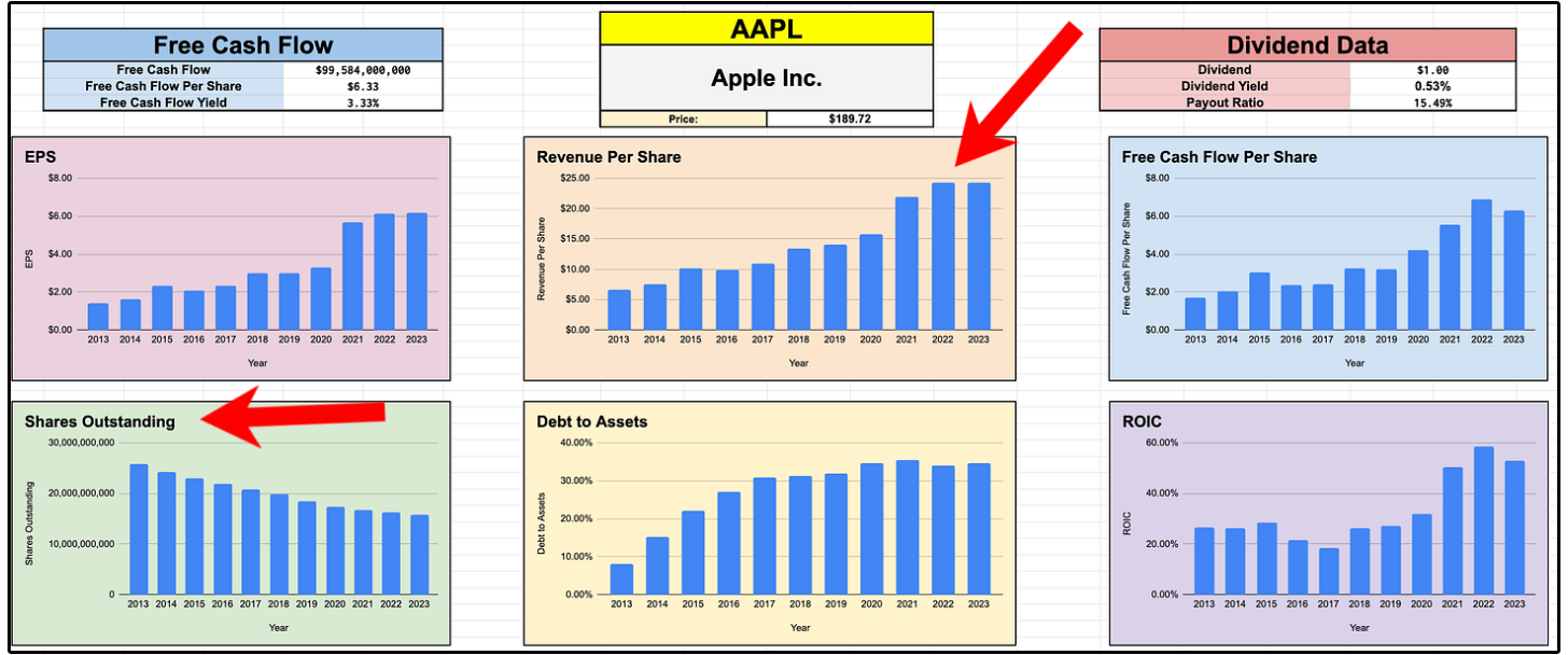 From 2013 to 2023, Apple’s revenue per share grew from $6.60 to $24.34.