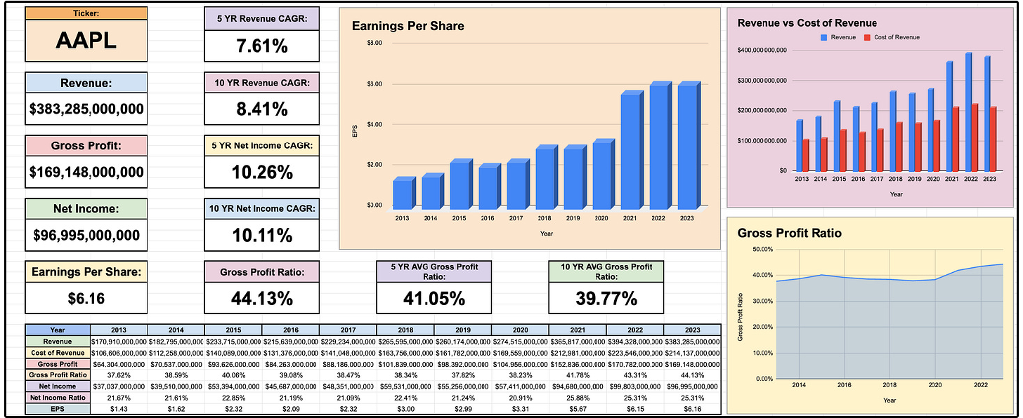Let’s look at Apple stock, for example. (Automated Spreadsheets from Tickerdata)