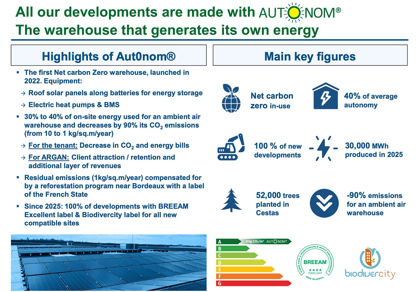 Argan has pioneered warehouses that produce their own green energy via rooftop solar and heat pumps, that they have branded as AutOnom.