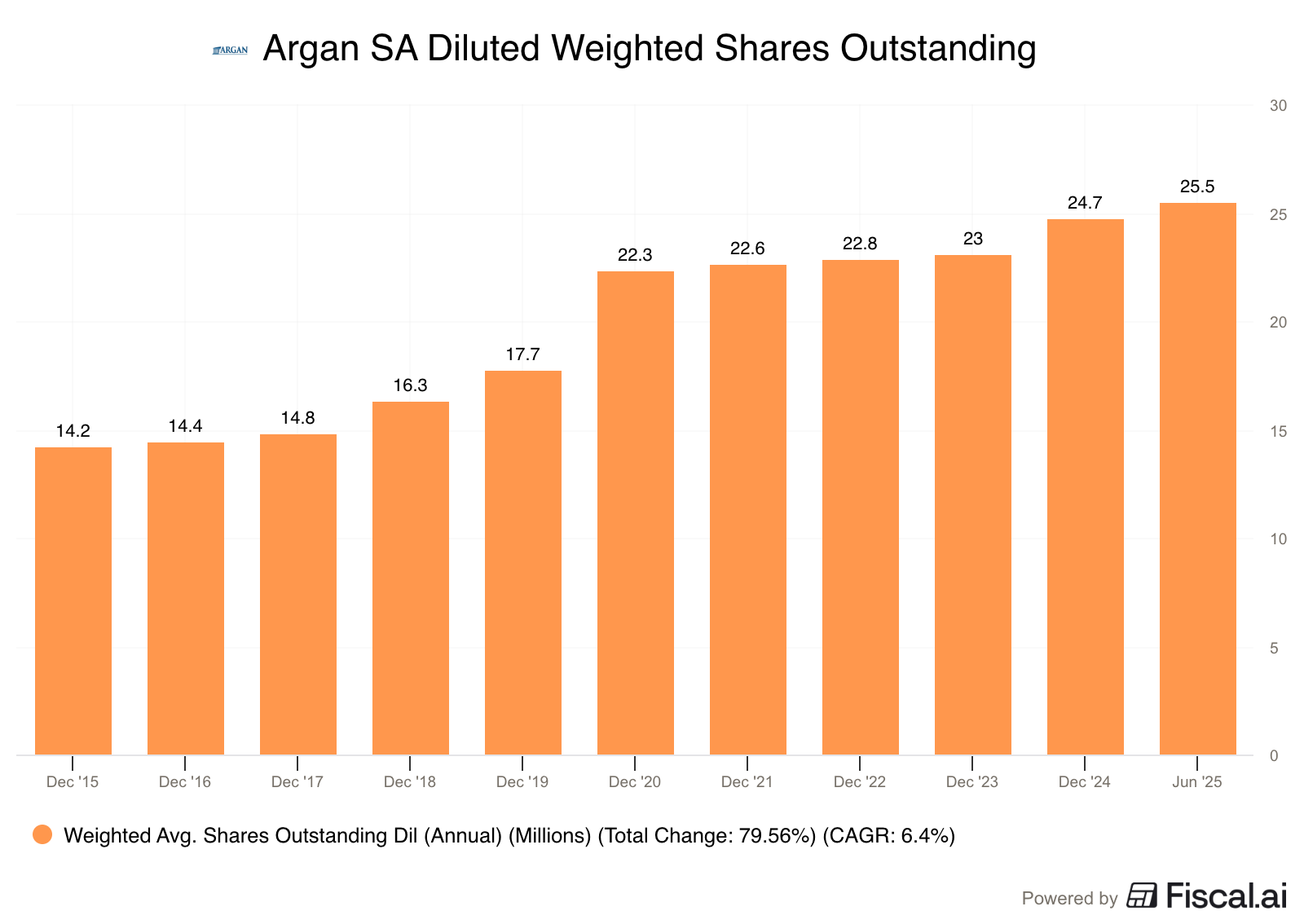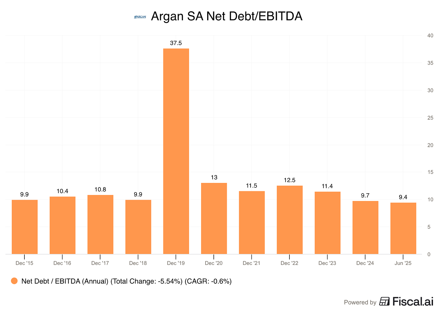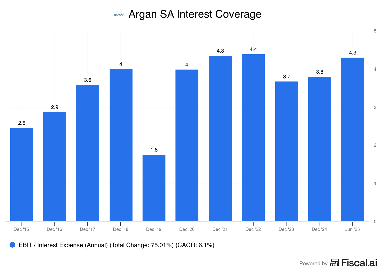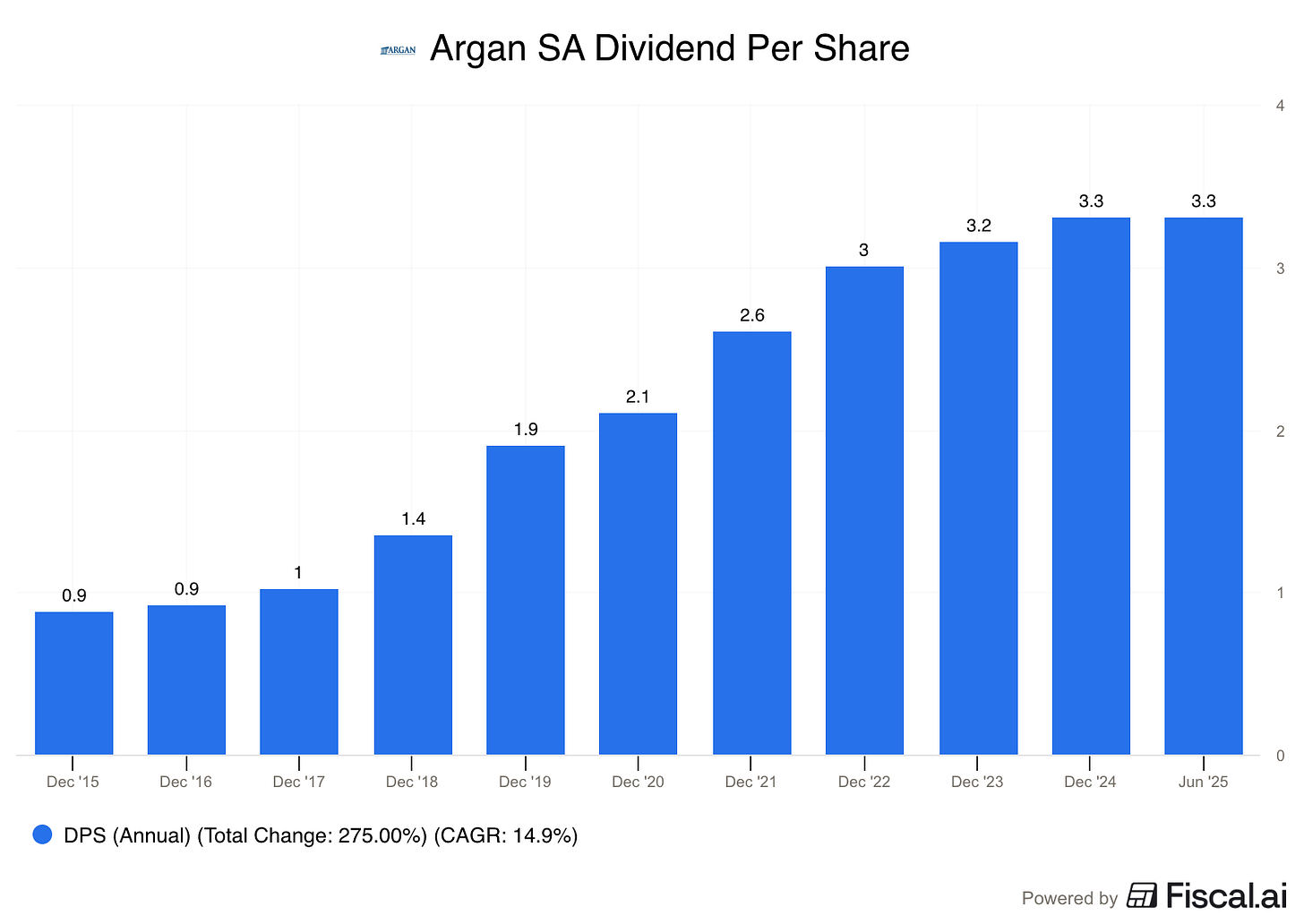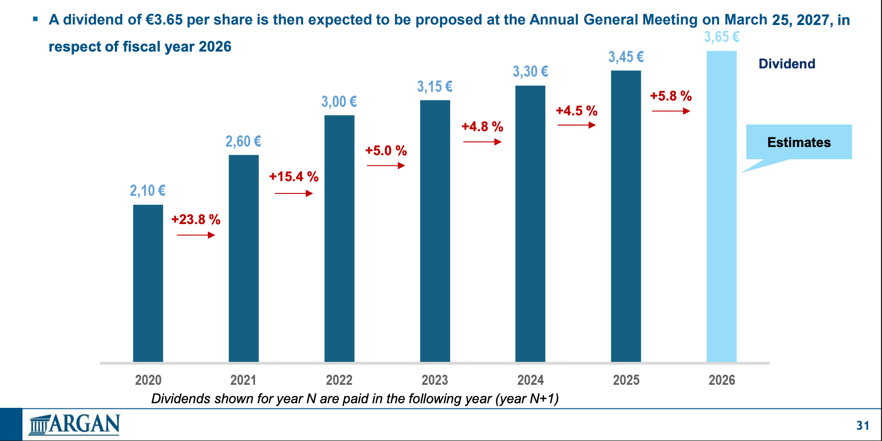 Argan is very conservative here. They paid out only 57.5% of their Recurring Net Income (€3.45 dividend / €6.00 earnings), leaving them plenty of cash to reinvest.