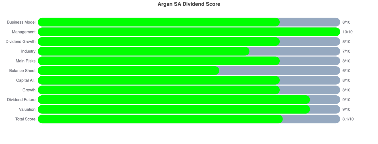 Argan SA receives a Dividend Score of 8.5/10. This is another very high quality company in my opinion. It offers a rare combination of a healthy 4%+ yield and high single-digit growth, all backed by the most stable tenants in Europe.