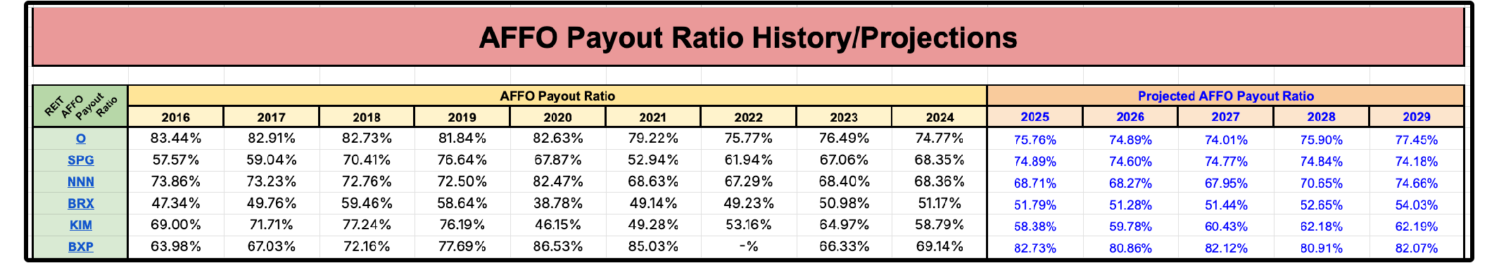 Here is small snippet of just a few of the REITs we track this for in the Dividendology Database: