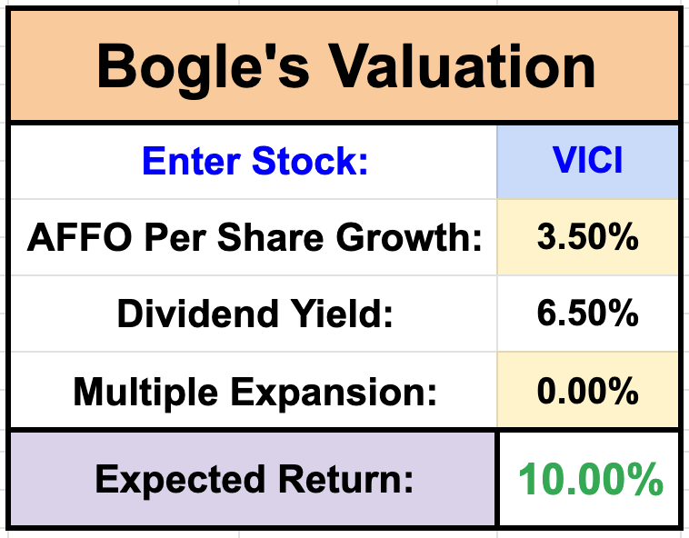 VICI has a yield of 6.5%, so assuming VICI grows AFFO per share at 3.5% moving forward-