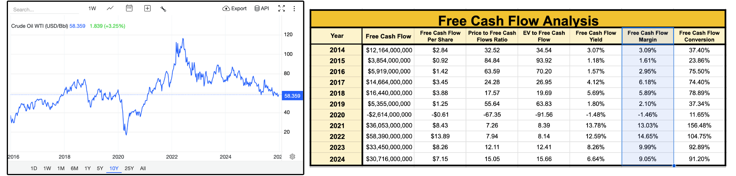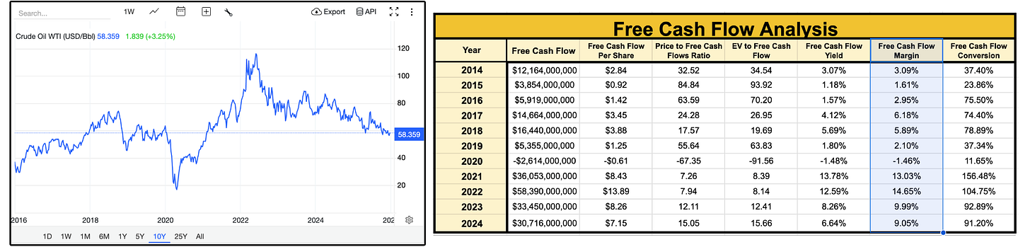 However, XOM is incredibly reliant on crude oil prices, and their free cash flow margin varies by a wide amount year after year as a result.