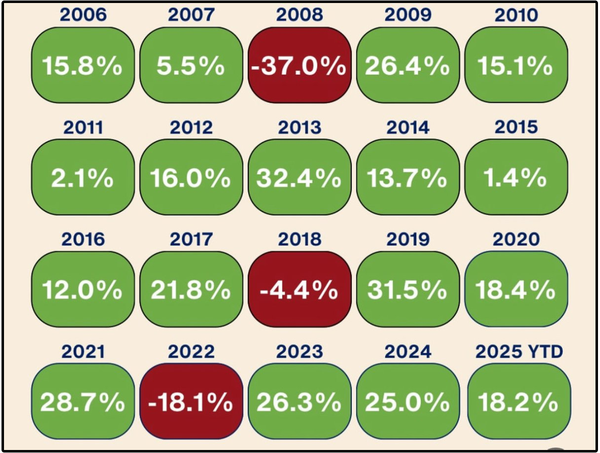 The S&P 500 is up around 18%, capping off what has been an extraordinary two-decade run for U.S. equities.