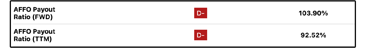 It has a high starting yield of around 7%, but despite this, theyâve endured multiple dividend cuts in the last 5 years and currently have a forward AFFO payout ratio of 103.9%.