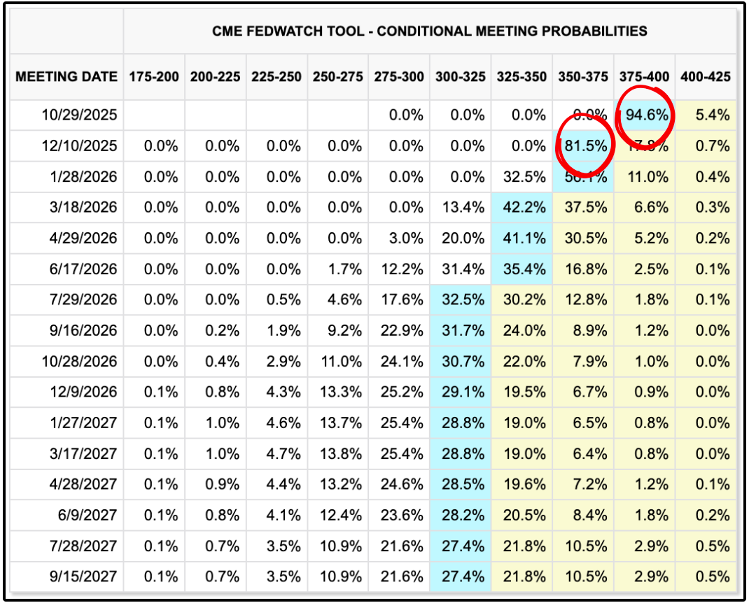 And the odds are currently showing a 94.6% chance of another rate cut on October 29th and an 81.5% chance of another rate cut on December 10th.