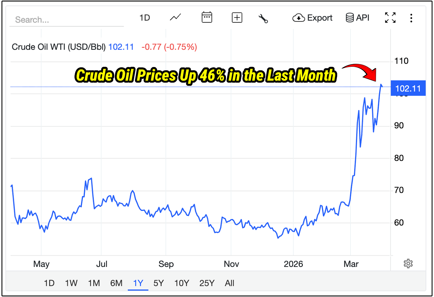 Crude oil is up 46% in just the last month, and is easily sitting at a 52 week high.