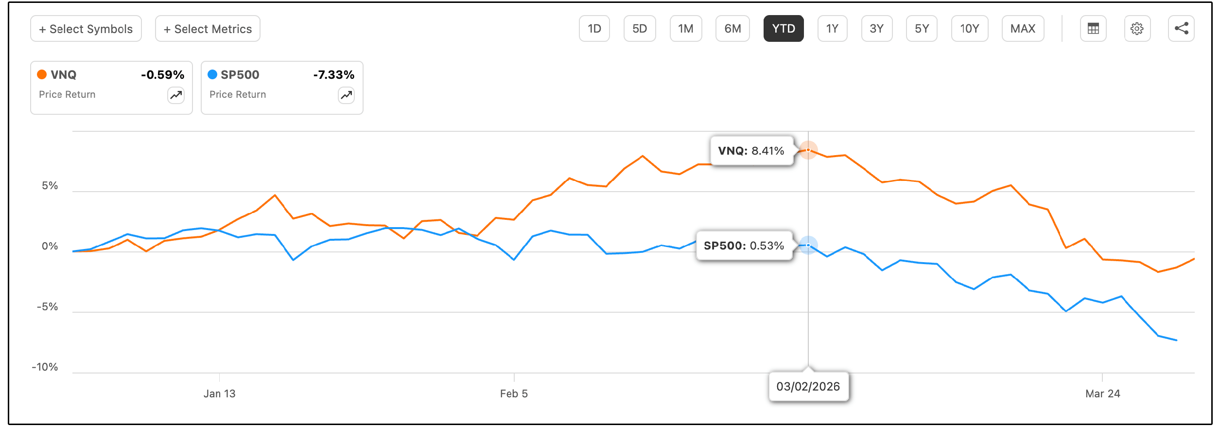 In fact, at the beginning of March, Vanguard’s Real Estate ETF (VNQ) was up 8.5%, while the S&P 500 was up only 0.5%.