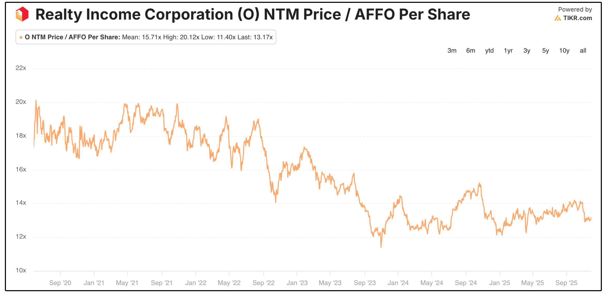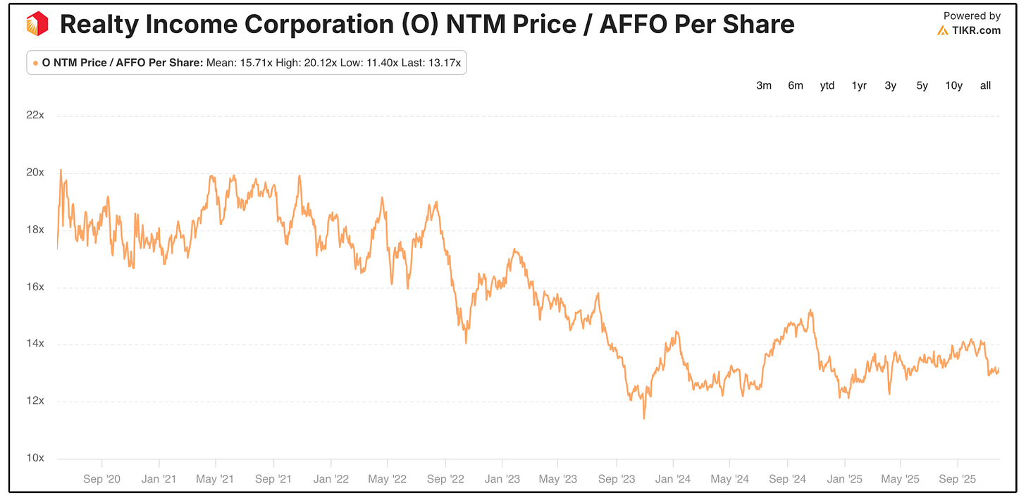 If we look at the most popular REIT on our list (Realty Income), we can see they are essentially trading at their lowest P/AFFO Per Share multiple in the last 5 years.