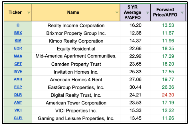 Valuations for REITs have been so compressed, that there is only 1 REIT in our investable universe trading above its 5 year average P/AFFO per share multiple valuation!