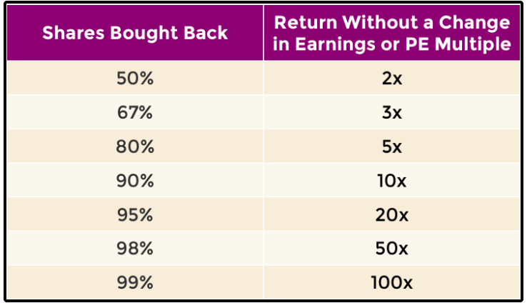 As a quick refresher, if a company bought back 50% of its outstanding shares, even without earnings growing or a change in the valuation multiple-
