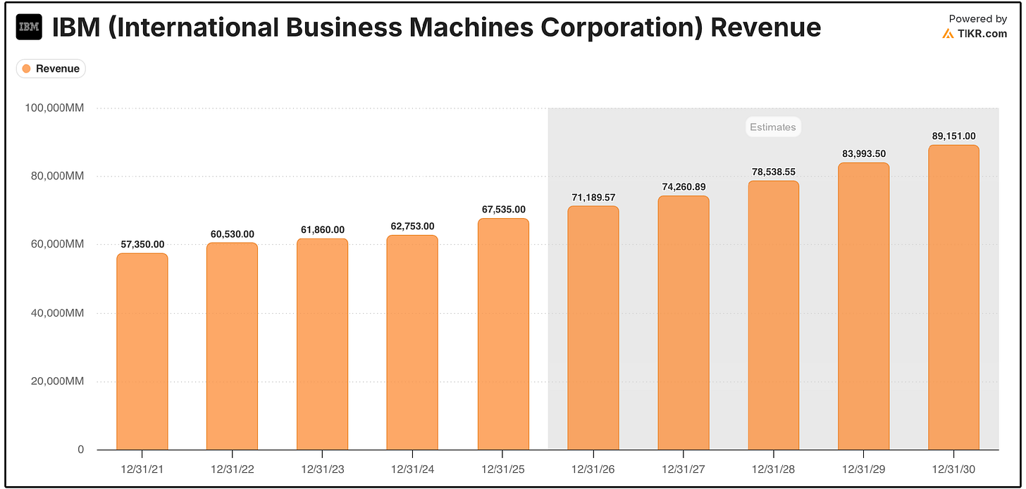 Hybrid cloud, automation, data, and transaction processing software. This is IBM’s AI platform layer and grew 9% in 2025.Consulting (~31% of revenue | $21B FY25)
