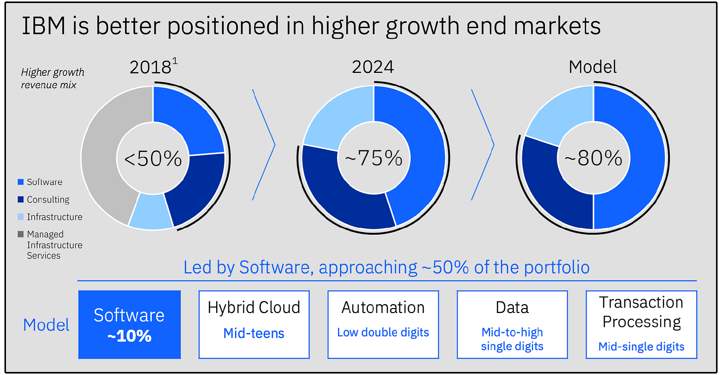 Under CEO Arvind Krishna, the company has repositioned itself around Hybrid Cloud + AI, with three primary business segments: