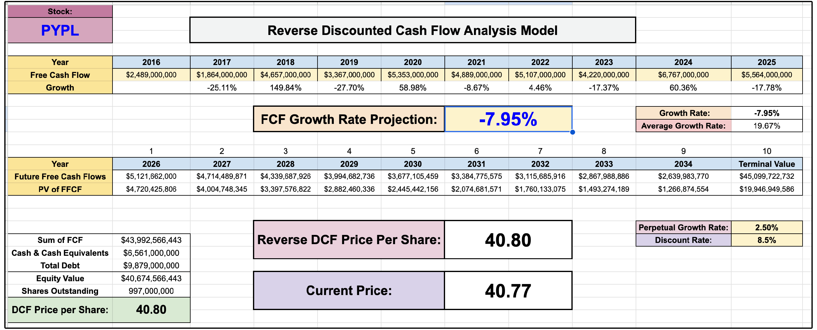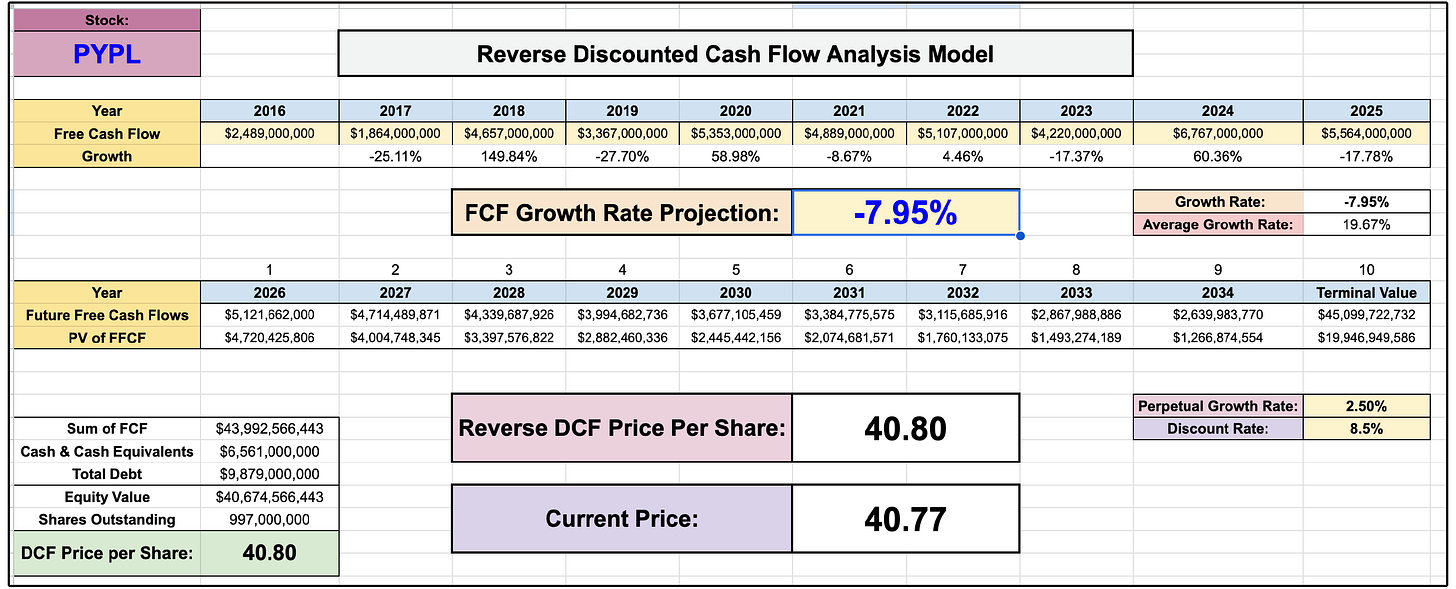 With that being said, PayPal is priced at peak fear, with the market currently pricing in nearly -8% annual free cash flow growth over the next decade.