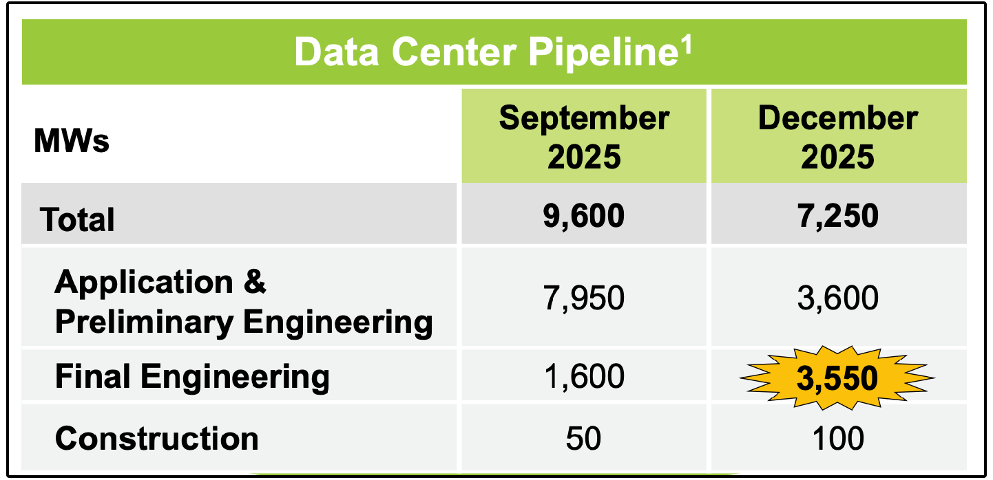 Projects in final engineering, meaning they are much closer to construction and actual power usage, more than doubled from 1,600 MW to 3,550 MW.