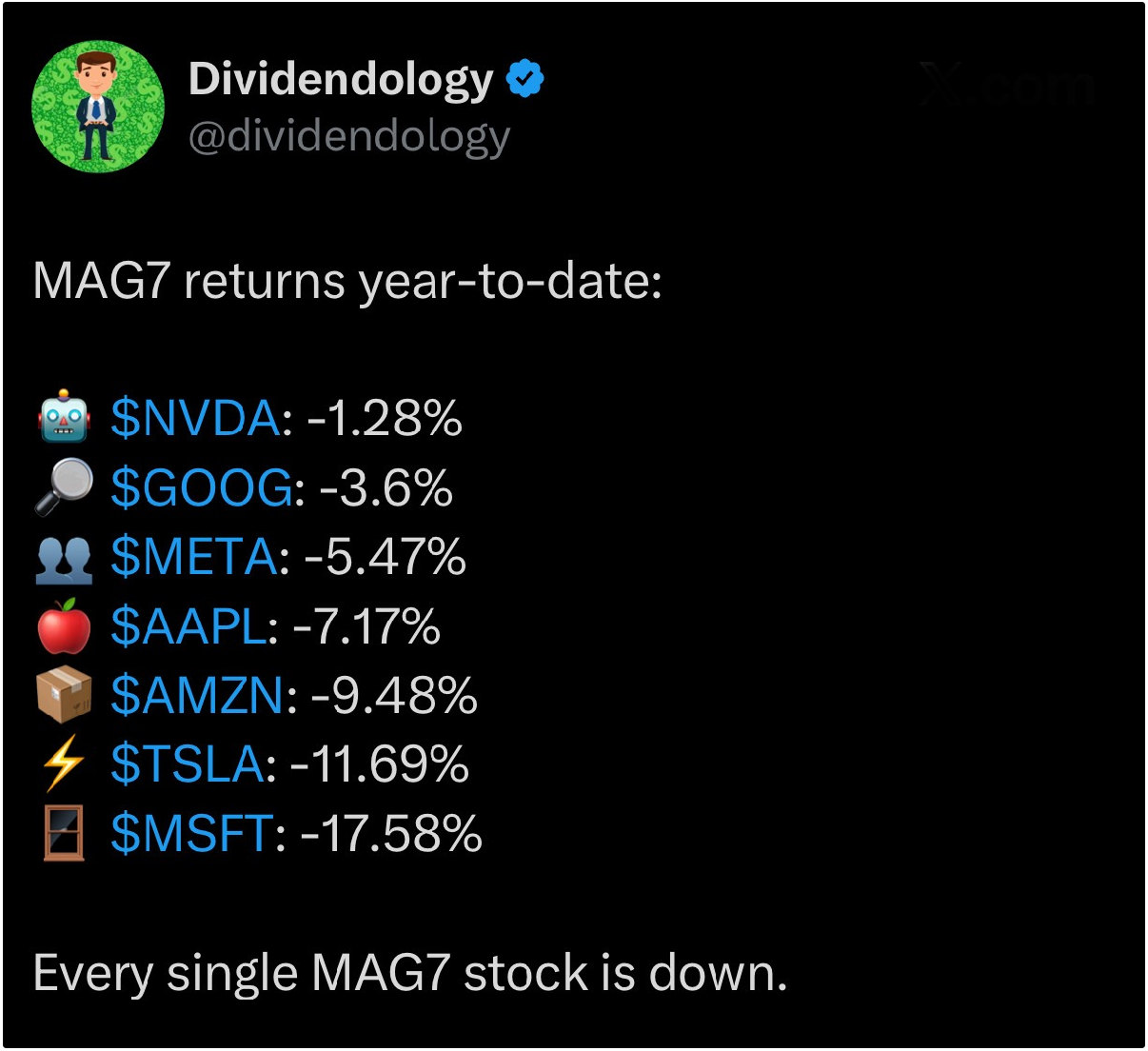 Every Mag7 stock is currently down year to date, with Meta currently down slightly over 5%.