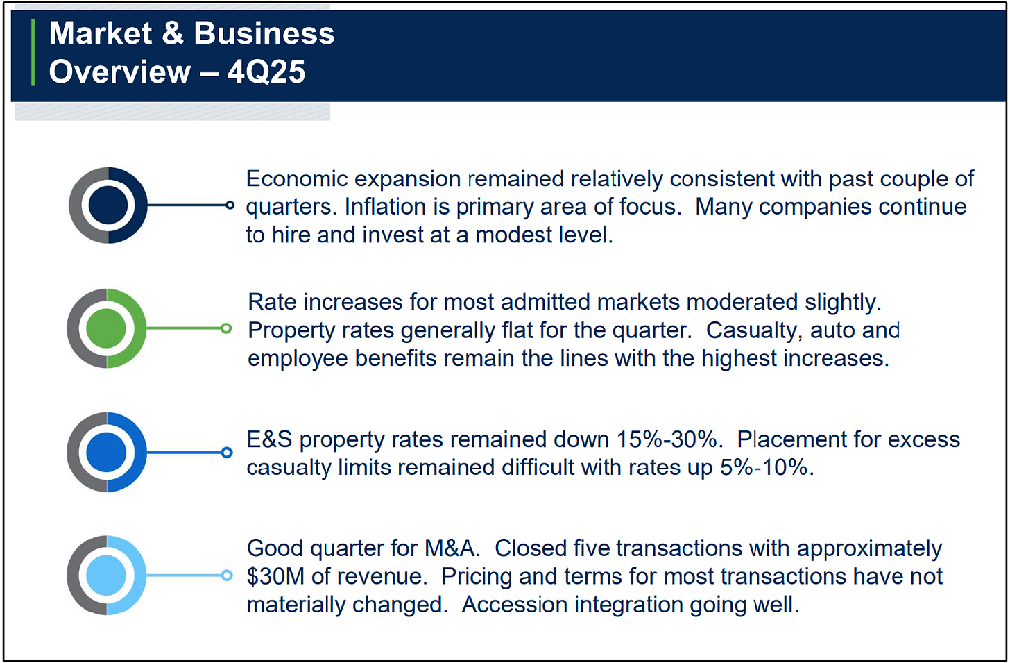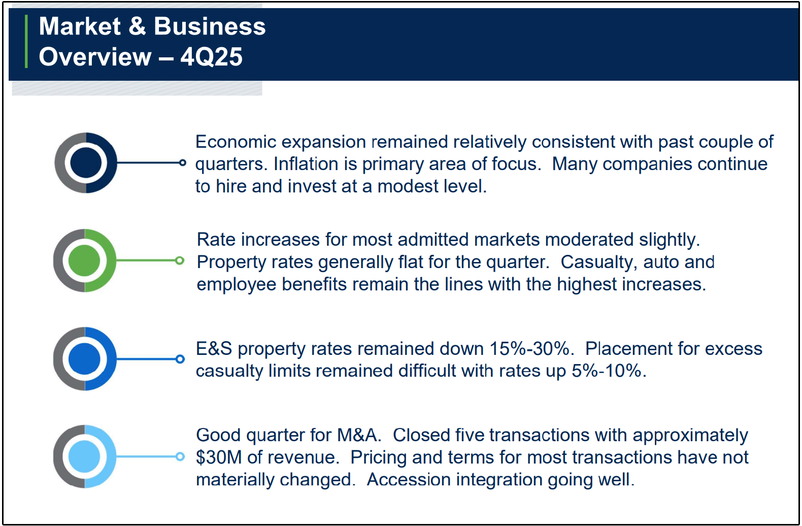 Looking ahead, management expects insurance pricing trends in 2026 to be somewhat mixed. According to CEO J. Powell Brown, casualty insurance rates (the largest segment of the market) are expected to continue rising, while property insurance rates may soften slightly due to the lack of major hurricane losses in 2025 and an increase in available capital.