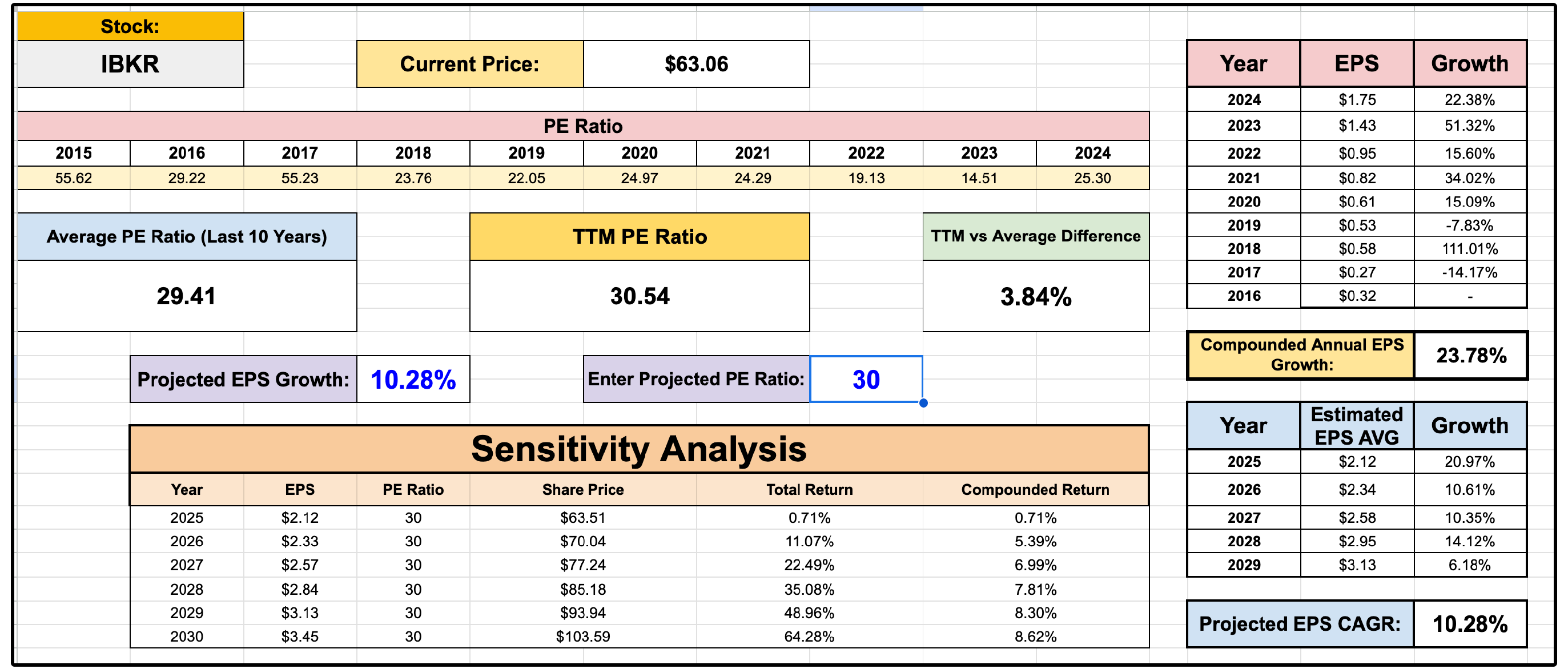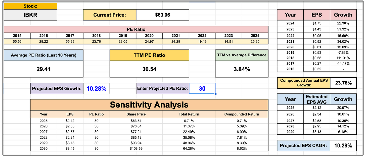 For IBKR to sustain returns of around 8.5% annually, they would need to maintain their 30x PE multiple and achieve the average analyst EPS growth rate projection of 10.28%.