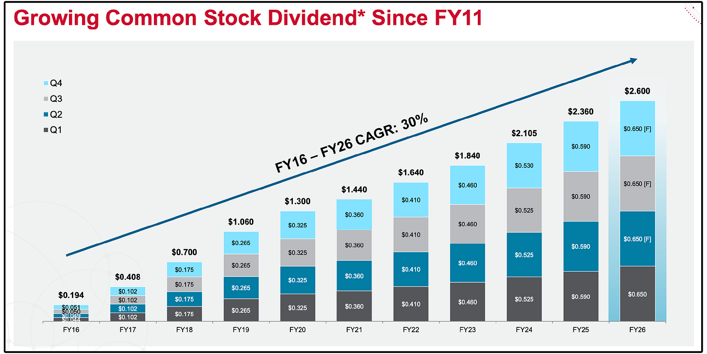 This strategy of acquisitions, combined with the AI boom, has led to rapid free cash flow growth and, in turn, incredible dividend growth.