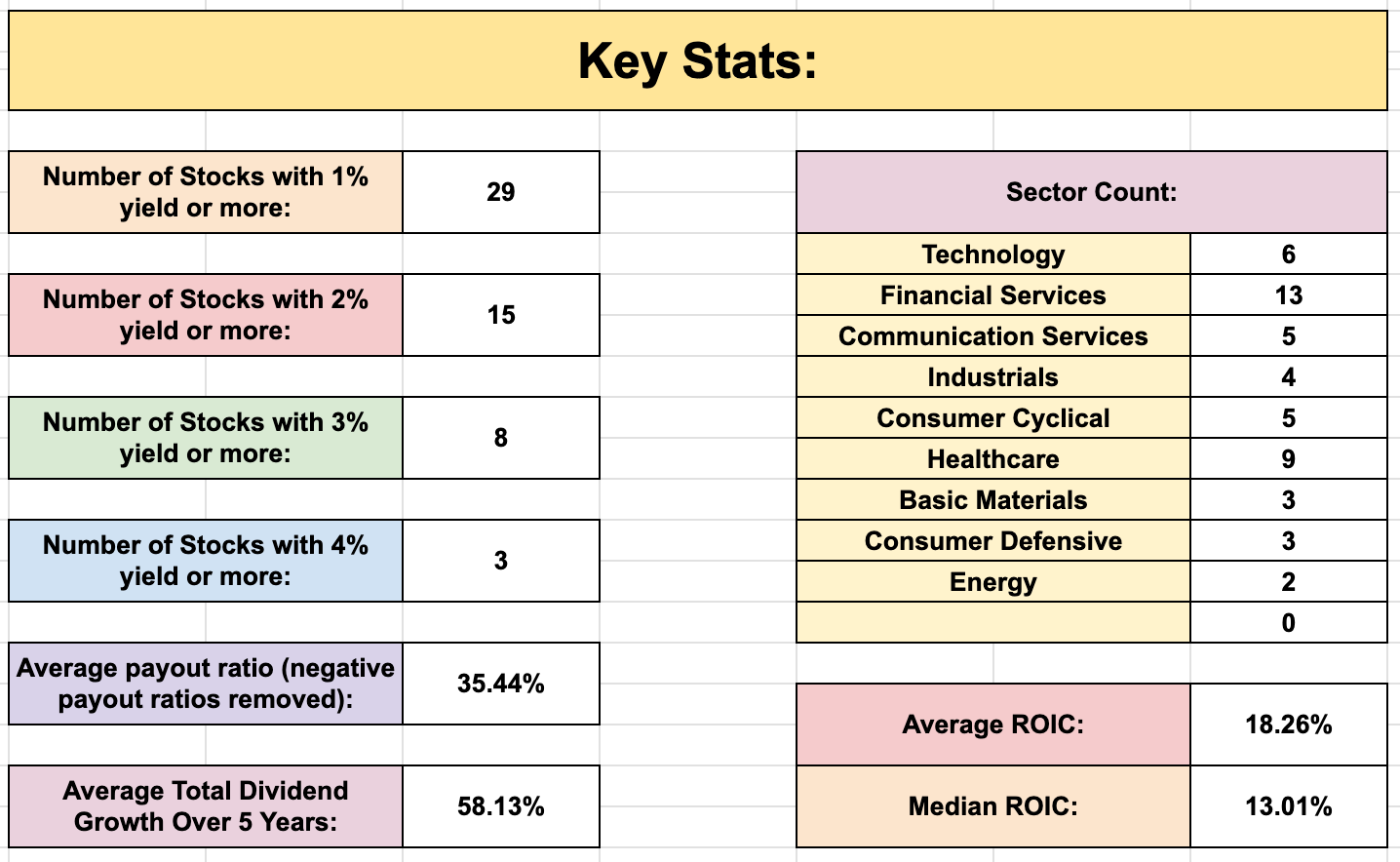 The average payout ratio for stocks on this list was just 3%, average total dividend growth over the past 5 years was almost 60%, and these stocks had an average return on invested capital of over 18%.