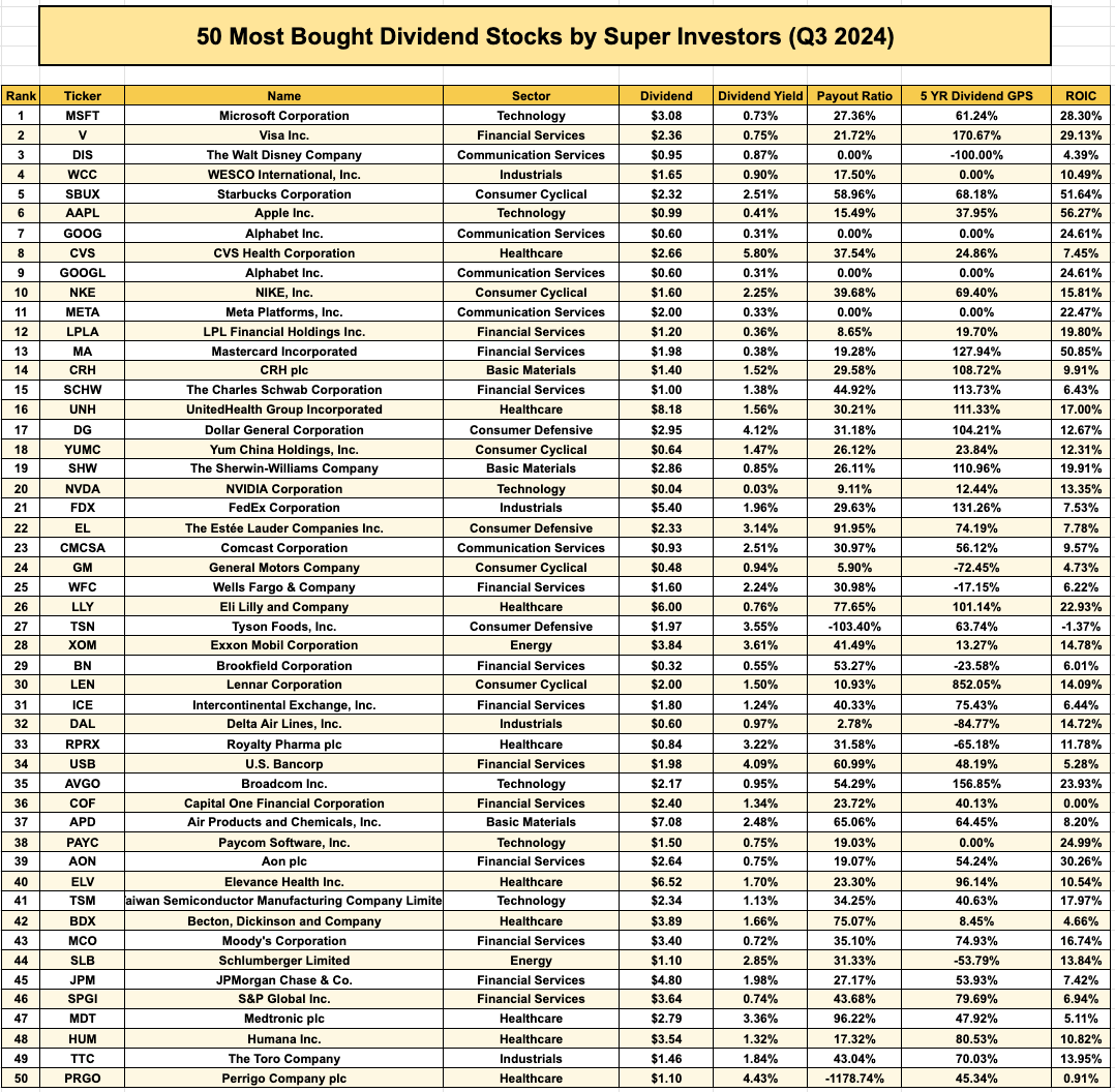 Look at the key stats I put together on the top 50 most frequently bought dividend stocks by Super Investors below: