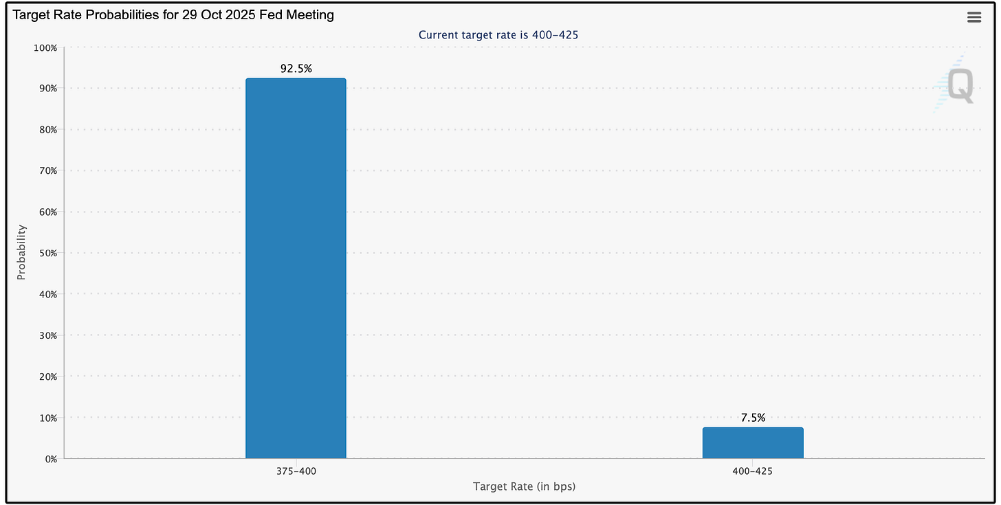 The FED cut rates last month, and the odds market is already showing a 92.5% chance we get another rate cut on October 29th.