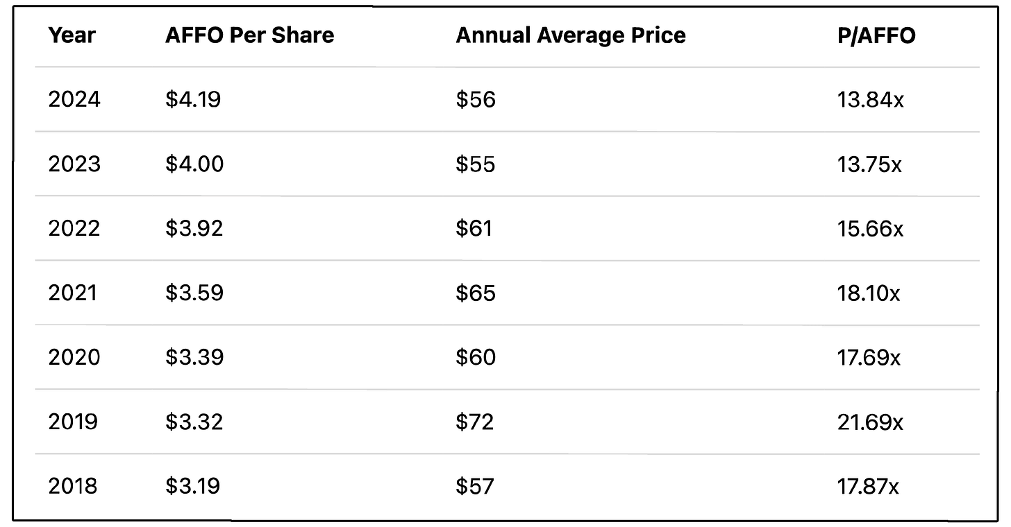 Despite the share price decline, AFFO per share has grown every year and they have been growing dividends.