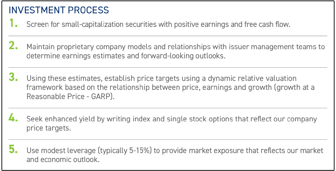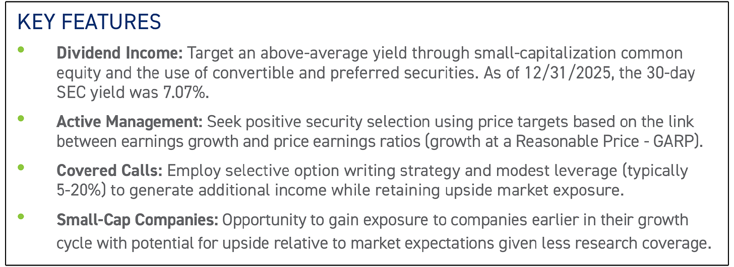 The goal is to deliver both capital appreciation + above-average income from small caps.