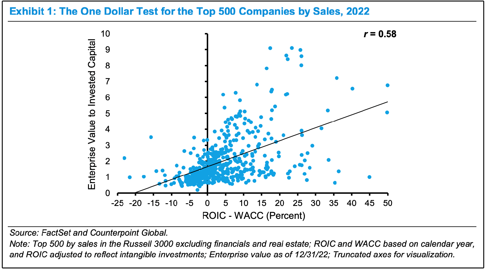 The horizontal axis (x-axis) shows the spread between a company’s ROIC and its WACC.