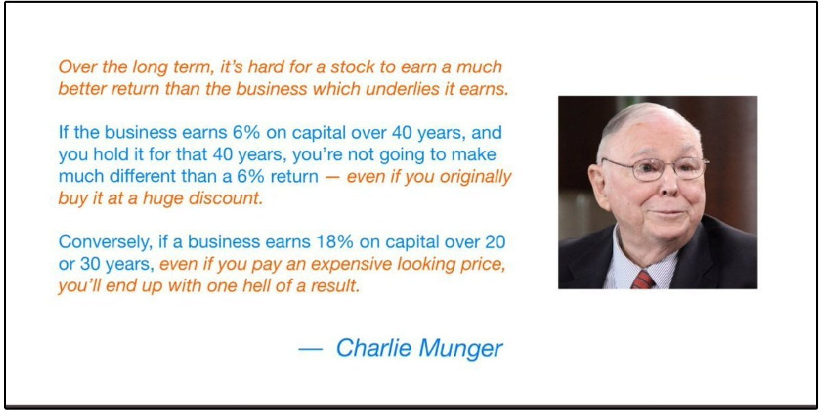 “We’ve really made the money out of high-quality businesses. Over the long term, it’s hard for a stock to earn a much better return than the business which underlies it earns.” -Charlie Munger