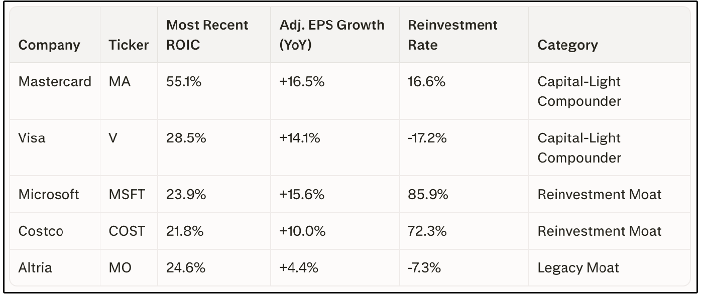 Visa has a negative reinvestment rate. This means it’s actually shrinking its invested capital base, largely through aggressive share buybacks, while still growing adjusted earnings by +14%. That’s the power of being a Capital-Light Compounder. It doesn’t need to invest more capital to grow.