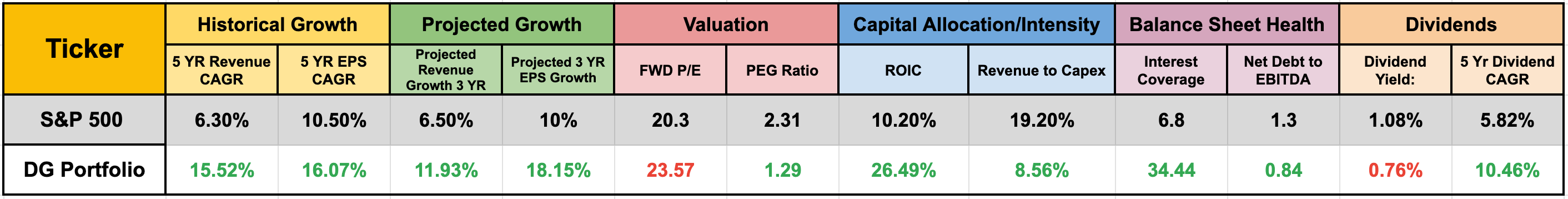 As you might suspect, our Dividend Growth Portfolio has an average ROIC that is significantly higher than the S&P 500.