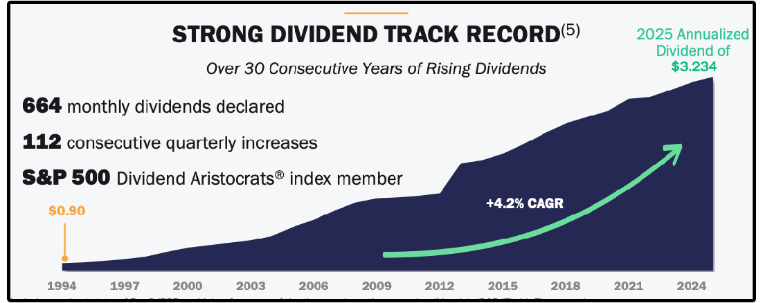 The company is known as “The Monthly Dividend Company” because it generates highly predictable rental income from long-term leases-
