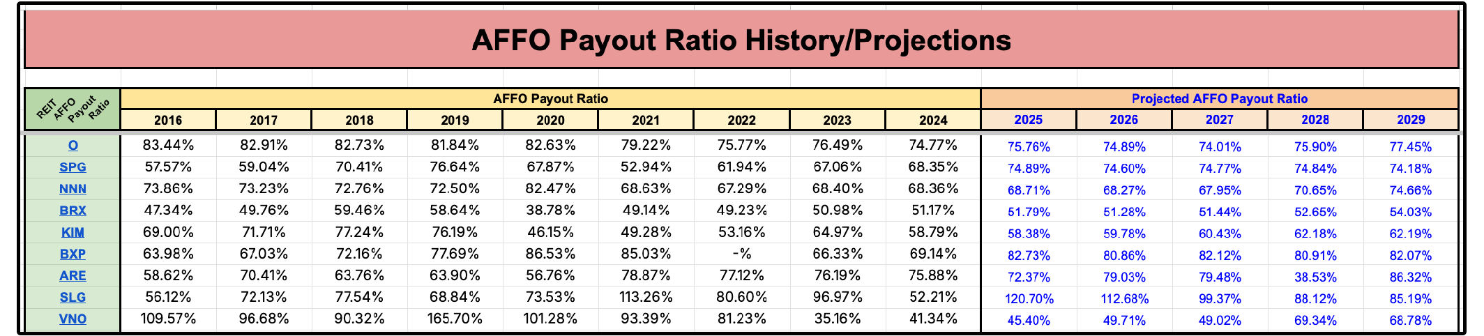 We closely track historical AFFO payout ratios, as well as projected AFFO payout ratios in the Dividendology REIT Database.