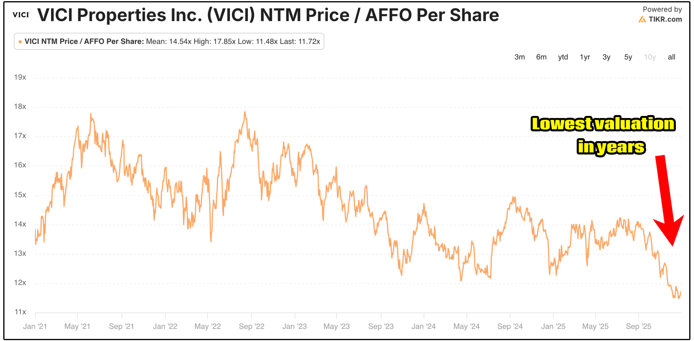 Despite being one of the highest-quality net-lease REITs in the S&P 500, VICI is trading near a 52-week low, pushing its dividend yield to 6.4%.