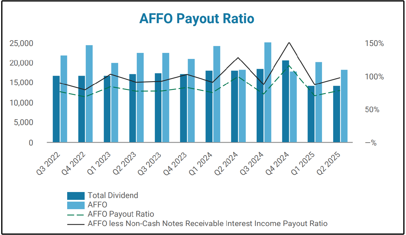 Importantly, management reset the dividend so it is now fully covered by rental income alone and not development fees, with the AFFO payout ratio back in the low-70% range.