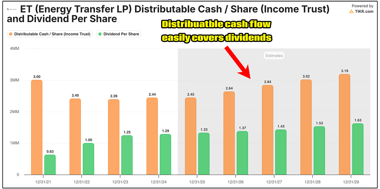 Because the majority of ET’s cash flows are fee-based and volume-driven and not directly tied to commodity prices, the business offers more predictability than many investors assume when they see an energy-related yield this high.