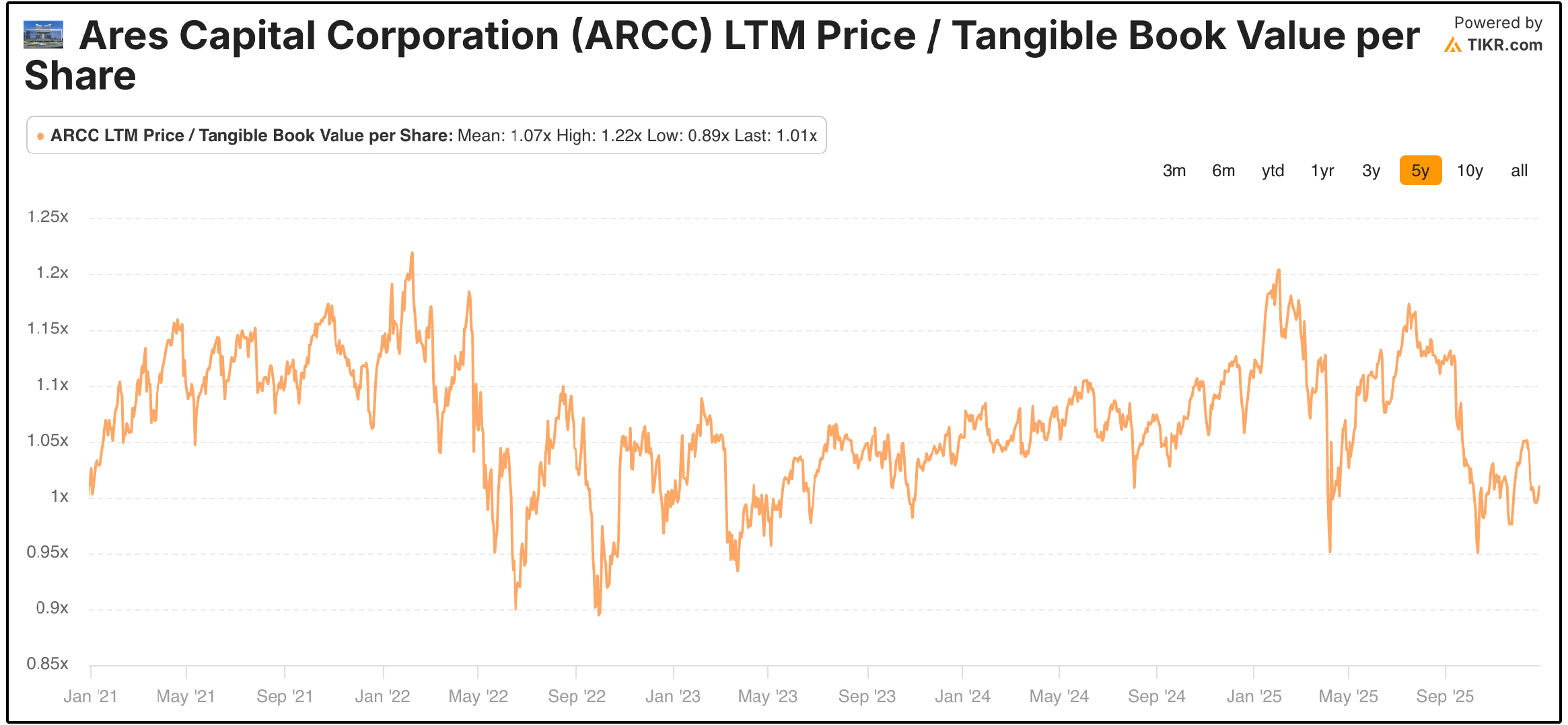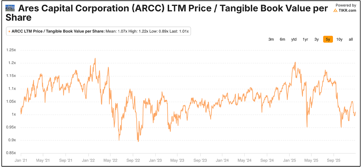 At today’s price, ARCC yields 9.5%, as well as trading slightly below its historical average P/TBVPS multiple.