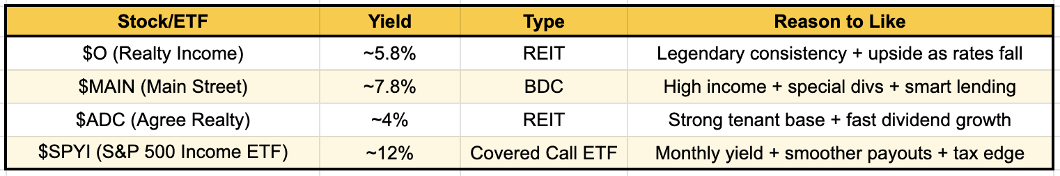 Each has its own unique advantages, whether you're looking for long-term reliability, high monthly income, dividend growth potential, or tax-efficient cash flow.